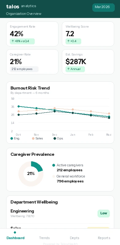 The Talos Analytics dashboard gives HR teams aggregate burnout trends, caregiver prevalence data, and ROI metrics — without ever seeing individual employee data.